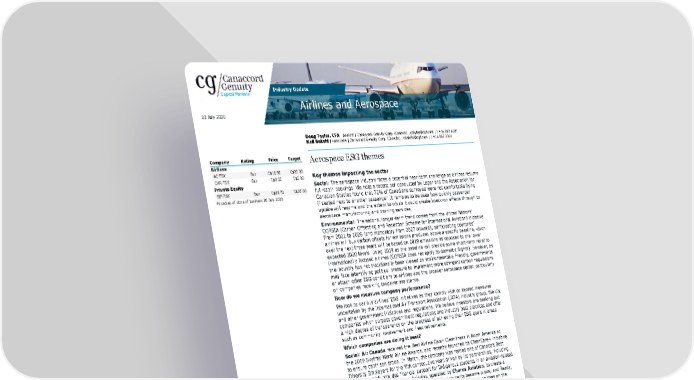 Industry Update Airlines and Aerospace 22 July 2020 Doug Taylor, CFA | Analyst | Canaccord Genuity Corp. (Canada) | [email protected] | 1.416.867.6101 Neil Bakshi | Associate | Canaccord Genuity Corp. (Canada) | [email protected] | 1.416.867.2366 Company Rating Price Target Aerospace ESG themes Airlines AC-TSX Buy C$16.98 C$25.00 Key themes impacting the sector CHR-TSX Buy C$2.55 C$5.00 Private Equity Social: The aerospace industry faces a potential near-term challenge as airlines resume EIF-TSX Buy C$26.72 C$35.00 full-cabin bookings. We note a recent poll conducted by Leger and the Association for Priced as of close of business 20 July 2020 Canadian Studies found that 72% of Canadians surveyed were not comfortable flying if seated next to another passenger. It remains to be seen how quickly passenger uptake will resume and the extent to which it could create knock-on effects through to aerospace manufacturing and training services. Environmental: The second, longer-term trend comes from the United Nations’ CORSIA (Carbon Offsetting and Reduction Scheme for International Aviation) initiative. From 2021 to 2026 (and mandatory from 2027 onward), participating countries’ airlines will buy carbon offsets for emissions produced above a specific baseline, which over the next three years will be based on 2019 emissions as opposed to the lower expected 2020 levels. Using 2019 as the baseline will provide some short-term relief to internationally focused airlines (CORSIA does not apply to domestic flights). However, as the industry has not traditionally been viewed as environmentally friendly, governments may face intensifying political pressure to implement more stringent carbon regulations or attach other ESG conditions to airlines and the broader aerospace sector, particularly on companies receiving taxpayer assistance. How do we measure company performance? We look to various airlines’ ESG initiatives as they comply with or exceed measures undertaken by the International Air Transport Association (IATA) industry group, the UN, and other government initiatives and regulations. We believe investors are seeking out companies which surpass government regulations and industry best practices and offer a high degree of transparency on the progress of achieving their ESG goals in areas such as community involvement and fleet retirements. Which companies are doing it best? Social: Air Canada received the Best Airline Cabin Cleanliness in North America at the 2019 Skytrax World Airline Awards, and recently launched its CleanCare+ initiative to ensure cabin sanitation. In March, the company was named one of Canada’s Best Diversity Employers for the fifth consecutive year, driven by its partnerships, including Indspire, which provides financial support for Indigenous students in an aviation-related program; a program with Jazz Aviation, operated by Chorus Aviation, to create a First Nations Technical Institute to help Aboriginal students become pilots; and Ready, Willing, and Able, which helps match candidates with intellectual disabilities on the Autism Spectrum Disorder with specific roles. Exchange Income’s airline operations include initiatives focused on First Nations groups: a pilot program with one community to fund a fish processing plant and discounted flight rates to southern markets; a chaperoned program which brings First Nations children to Winnipeg CFL and NHL games; and its Life in Flight pilot training program, which focuses on recruiting from First Nations communities. Environment: Air Canada’s Leave Less targets have endorsed industry-wide goals, including a 1.5% average improvement in fuel efficiency per year from 2009 to 2020, a cap on net aviation CO emissions from 2020, and a 50% reduction in net aviation CO 2 2 emissions by 2050 relative to 2005 levels. The company has also recently accelerated the retirement of 79 older aircraft, reducing its carbon footprint. Air Canada and Jazz are both participants in CORSIA. Governance: Air Canada’s board of directors is 91% independent, with women holding four of 12 seats and a third of executive committee positions. Canaccord Genuity is the global capital markets group of Canaccord Genuity Group Inc. (CF : TSX) The recommendations and opinions expressed in this research report accurately reflect the research analyst's personal, independent and objective views about any and all the companies and securities that are the subject of this report discussed herein. 22 July 2020 2