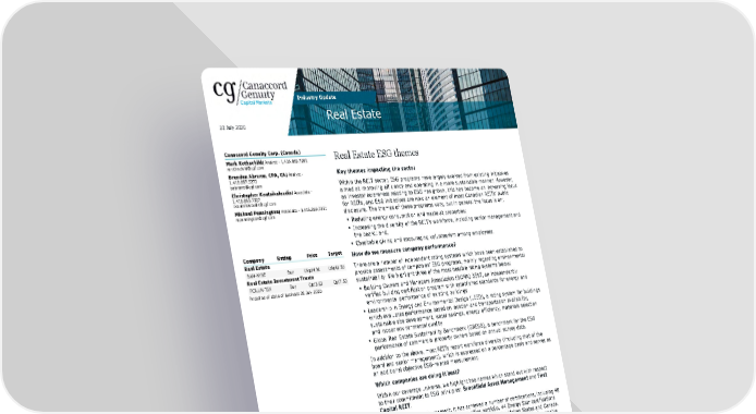 Industry Update Real Estate 22 July 2020 Canaccord Genuity Corp. (Canada) Real Estate ESG themes Mark Rothschild| Analyst - 1.416.869.7280 [email protected] Brendon Abrams, CPA, CA| Analyst - Key themes impacting the sector 1.416.687.5270 [email protected] Within the REIT sector, ESG programs have largely evolved from existing initiatives Christopher Koutsikaloudis| Associate - aimed at improving efficiency and operating in a more sustainable manner. However, 1.416.869.7307 as investor awareness relating to ESG has grown, this has become an increasing focus [email protected] for REITs, and ESG initiatives are now an element of most Canadian REITs’ public Michael Pennington| Associate - 1.416.869.7351 disclosure. The themes of these programs vary, but in general the focus is on: [email protected] • Reducing energy consumption and waste at properties; • Increasing the diversity of the REIT’s workforce, including senior management and the board; and, • Charitable giving and encouraging volunteerism among employees. Company Rating Price Target How do we measure company performance? Real Estate BAM-NYSE Buy US$34.30 US$42.50 There are a number of independent rating systems which have been established to Real Estate Investment Trusts provide assessments of companies’ ESG programs, mainly regarding environmental FCR.UN-TSX Buy C$13.62 C$17.50 sustainability. We highlight three of the most notable rating systems below: Priced as of close of business 20 July 2020 • Building Owners and Managers Association (BOMA) BEST, an independently verified building certification program with established standards for energy and environmental performance of existing buildings. • Leadership in Energy and Environmental Design (LEED), a rating system for buildings which evaluates performance based on location and transportation availability, sustainable site development, water savings, energy efficiency, materials selection and indoor environmental quality. • Global Real Estate Sustainability Benchmark (GRESB), a benchmark for the ESG performance of commercial property owners based on annual survey data. In addition to the above, most REITs report workforce diversity (including that of the board and senior management), which is expressed on a percentage basis and serves as an additional objective ESG-related measurement. Which companies are doing it best? Within our coverage universe, we highlight two names which stand out with respect to their commitment to ESG principles: Brookfield Asset Management and First Capital REIT. Within BAM’s property segment, it has achieved a number of certifications, including 48 LEED certifications in its North American office portfolio, 44 Energy Star certifications in the United States, and 52 BOMA 360 certifications in the United States and Canada. BAM is also the asset manager to, and owns a 57% interest in, Brookfield Renewable Partners, a renewable power company with US$47 billion of assets under management across the Americas, Europe and Asia. FCR is targeting a 9% reduction in greenhouse gas emissions between 2018 and 2021 and has announced that it will be upgrading all exterior lighting to LED lighting by the end of 2020. The REIT has achieved a BOMA BEST rating for properties amounting to 76% of its GLA and has obtained LEED certifications for properties amounting to 16%. In addition, over 50% of the REIT’s workforce is female, and all full-time employees are entitled to one paid day off annually to volunteer for a charity of their choice. Canaccord Genuity is the global capital markets group of Canaccord Genuity Group Inc. (CF : TSX) The recommendations and opinions expressed in this research report accurately reflect the research analyst's personal, independent and objective views about any and all the companies and securities that are the subject of this report discussed herein. 22 July 2020 10