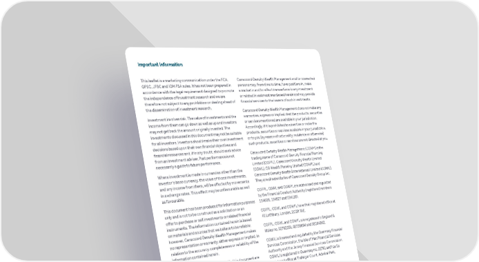 Important information This leaflet is a marketing communication under the FCA, Canaccord Genuity Wealth Management and/or connected GFSC, JFSC and IOM FSA rules. It has not been prepared in persons may, from time to time, have positions in, make accordance with the legal requirement designed to promote a market in and/or effect transactions in any investment the independence of investment research and we are or related investment mentioned herein and may provide therefore not subject to any prohibition on dealing ahead of financial services to the issuers of such investments. the dissemination of investment research. Canaccord Genuity Wealth Management does not make any Investment involves risk. The value of investments and the warranties, express or implied, that the products, securities income from them can go down as well as up and investors or services mentioned are available in your jurisdiction. may not get back the amount originally invested. The Accordingly, if it is prohibited to advertise or make the investments discussed in this document may not be suitable products, securities or services available in your jurisdiction, for all investors. Investors should make their own investment or to you (by reason of nationality, residence or otherwise) decisions based upon their own financial objectives and such products, securities or services are not directed at you. financial resources and, if in any doubt, should seek advice Canaccord Genuity Wealth Management (CGWM) is the from an investment adviser. Past performance is not trading name of Canaccord Genuity Financial Planning necessarily a guide to future performance. Limited (CGFPL), Canaccord Genuity Wealth Limited Where investment is made in currencies other than the (CGWL), CG Wealth Planning Limited (CGWPL) and investor’s base currency, the value of those investments, Canaccord Genuity Wealth (International) Limited (CGWIL). and any income from them, will be affected by movements They are all subsidiaries of Canaccord Genuity Group Inc. in exchange rates. This effect may be unfavourable as well CGFPL, CGWL and CGWPL are authorised and regulated as favourable. by the Financial Conduct Authority (registered numbers This document has been produced for information purposes 154608, 194927 and 594155). only and is not to be construed as a solicitation or an CGFPL, CGWL and CGWPL have their registered office at offer to purchase or sell investments or related financial 41 Lothbury, London, EC2R 7AE. instruments. The information contained herein is based on materials and sources that we believe to be reliable; CGFPL, CGWL and CGWPL are registered in England & however, Canaccord Genuity Wealth Management makes Wales no. 02762351, 03739694 and 08284862. no representation or warranty, either express or implied, in CGWIL is licensed and regulated by the Guernsey Financial relation to the accuracy, completeness or reliability of the Services Commission, the Isle of Man Financial Services information contained herein. Authority and the Jersey Financial Services Commission. All opinions and estimates included in this document are CGWIL is registered in Guernsey no. 22761 and has its subject to change without notice and Canaccord Genuity registered office at Trafalgar Court, Admiral Park, Wealth Management is under no obligation to update the St. Peter Port, GY1 2JA. information contained herein. None of Canaccord Genuity CGWL and CGWIL are members of the London Stock Exchange. Wealth Management, its affiliates or employees shall have any liability whatsoever for any indirect or consequential loss or damage arising from any use of this document. Investment themes 2022 4